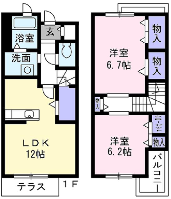 | 間取内容 | LDK12畳 1階 1室 洋室6.7畳 2階 1室 洋室6.2畳 2階 1室 | ||